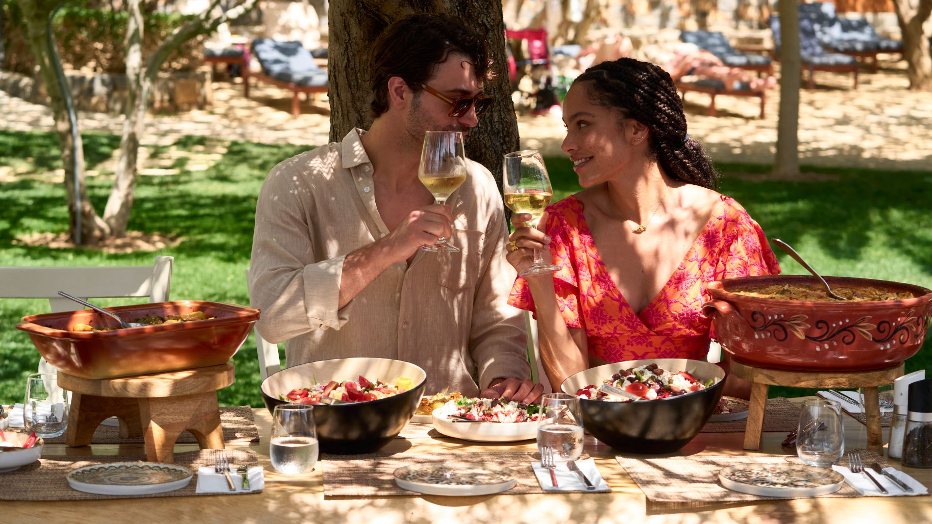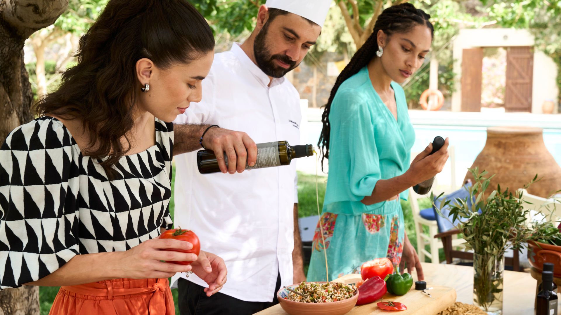 Jetez un coup d'œil dans la cuisine d'une maison grecque traditionnelle grâce à nos trois postes de préparation culinaire en direct et sous vos yeux, puis savourez les mets et les vins exceptionnels qui offrent le goût inoubliable de la tradition culinaire crétoise.